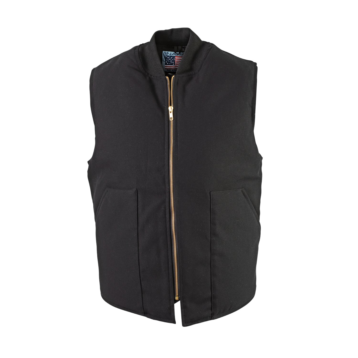 This black vest is made from durable 100% cotton duck and features a full front zipper with two handy front pockets. Quilted insulation with polyester fiberfill and nylon lining keeps you warm without the bulk. Black only. Sizes: S-4XL. Please call for pricing.