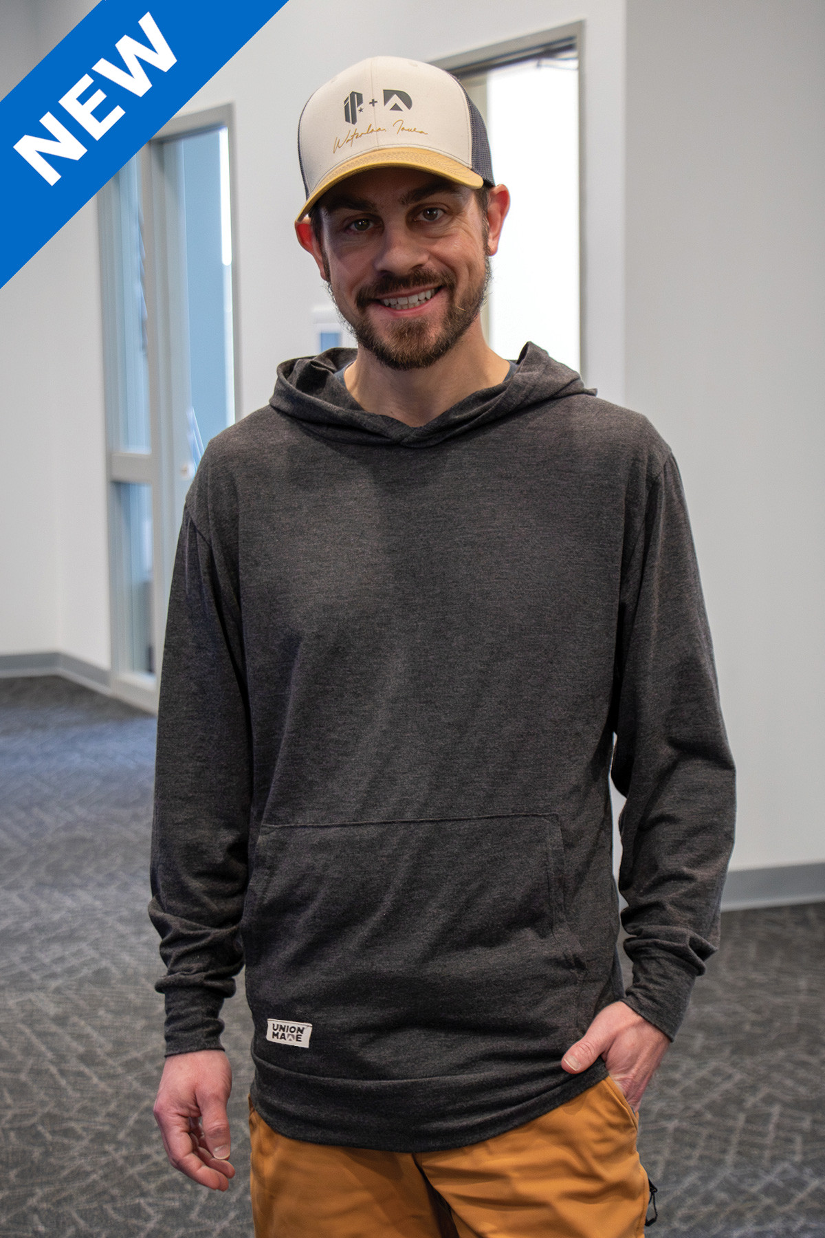 All triblend hoodies feature a small print on the lower left sleeve that proudly marks them as made by union hands. Measures 1.5” x 0.875” (W/H).