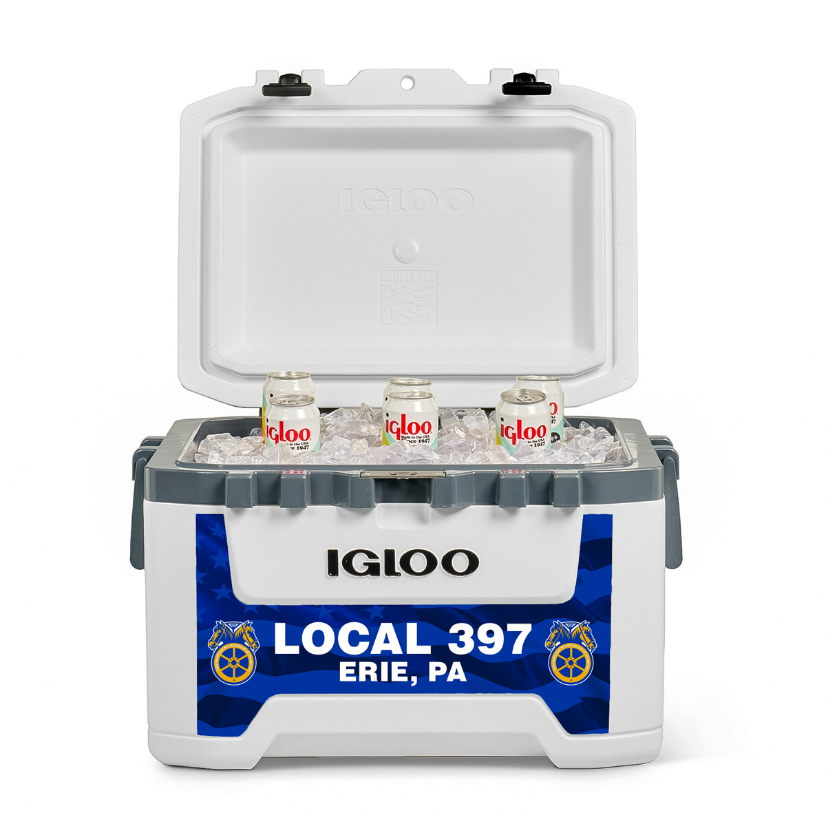 The Igloo Overland® 50-quart Cooler features 1.5” insulated walls and lid for extended ice retention, holding up to 81 cans. Includes a built-in bottle opener, Cool Riser Technology®, and full color transfer logo. Made in the USA, union-printed. 19.25” x 10” (W/H).