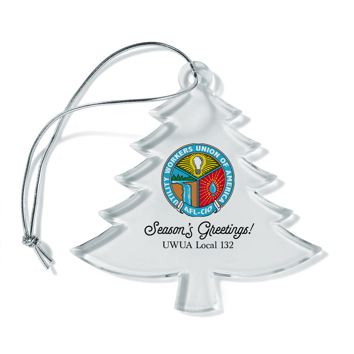 Clear acrylic ornament in the shape of a tree, with full-color, full-surface printing. 4” x 3” x 0.2” (HxWxD). Min. 100.