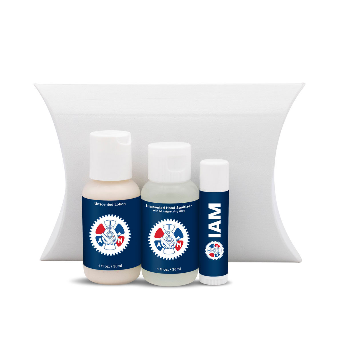 Our Thank You Kit comes ready to deliver with our favorite USA-made products – a 60% Unscented Hand Sanitizer Gel Bottle 1 fl. oz., Toasted Vanilla Lotion, and Burt’s Bees ® national brand equivalent Bee Minty Lip Balm. Packaged in a white pillow box.